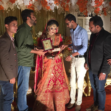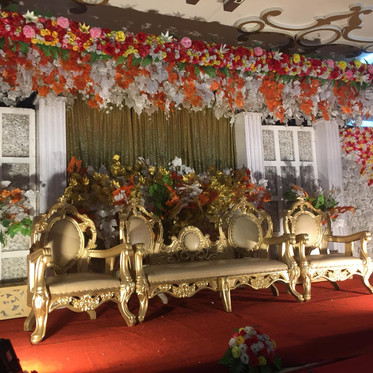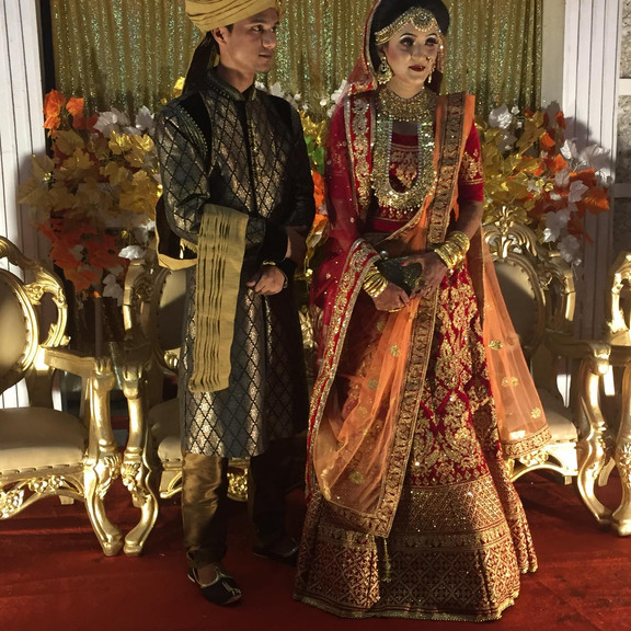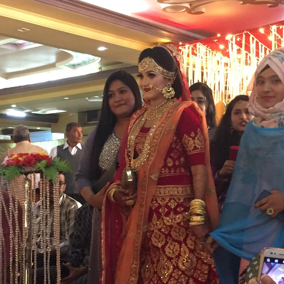 We were ushered into the hall and doted on the whole time… from making sure we were introduced to her whole family, to insisting that we sit right at the front on the comfy couches, to intently watching us eat lunch – and if we even paused eating for a moment someone would come right over to us to make sure everything was ok. The hall was decorated in reds, greens, whites, golds, and oranges… from the garland on the staircases, to the flowers, chairs, and decorations hanging from the ceilings. The hall had two floors… downstairs was the ceremony sitting area, the kitchen, the tables where the men ate, and the men’s washrooms; whereas upstairs were the women’s tables and washrooms. However, because we were foreigners they allowed us to all eat at the same table – us and the other male national staff that we arrived with.