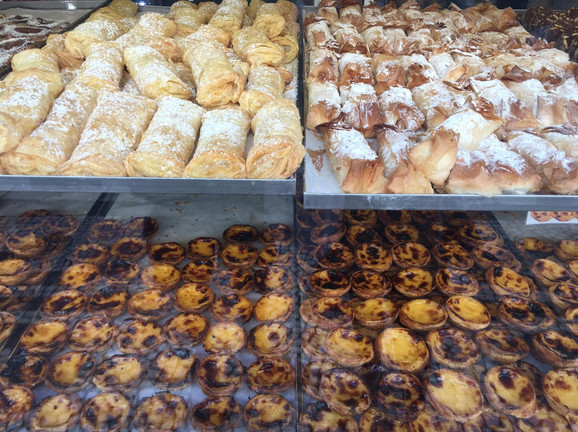 (Left): Inside Pasteis de Belem. (Right): Portugese pasteries with pastel de nata at the bottom, however, this picture is not from Pasteis de Belem because they’re continually prepared in the back kitchen, not left in a display case up front.