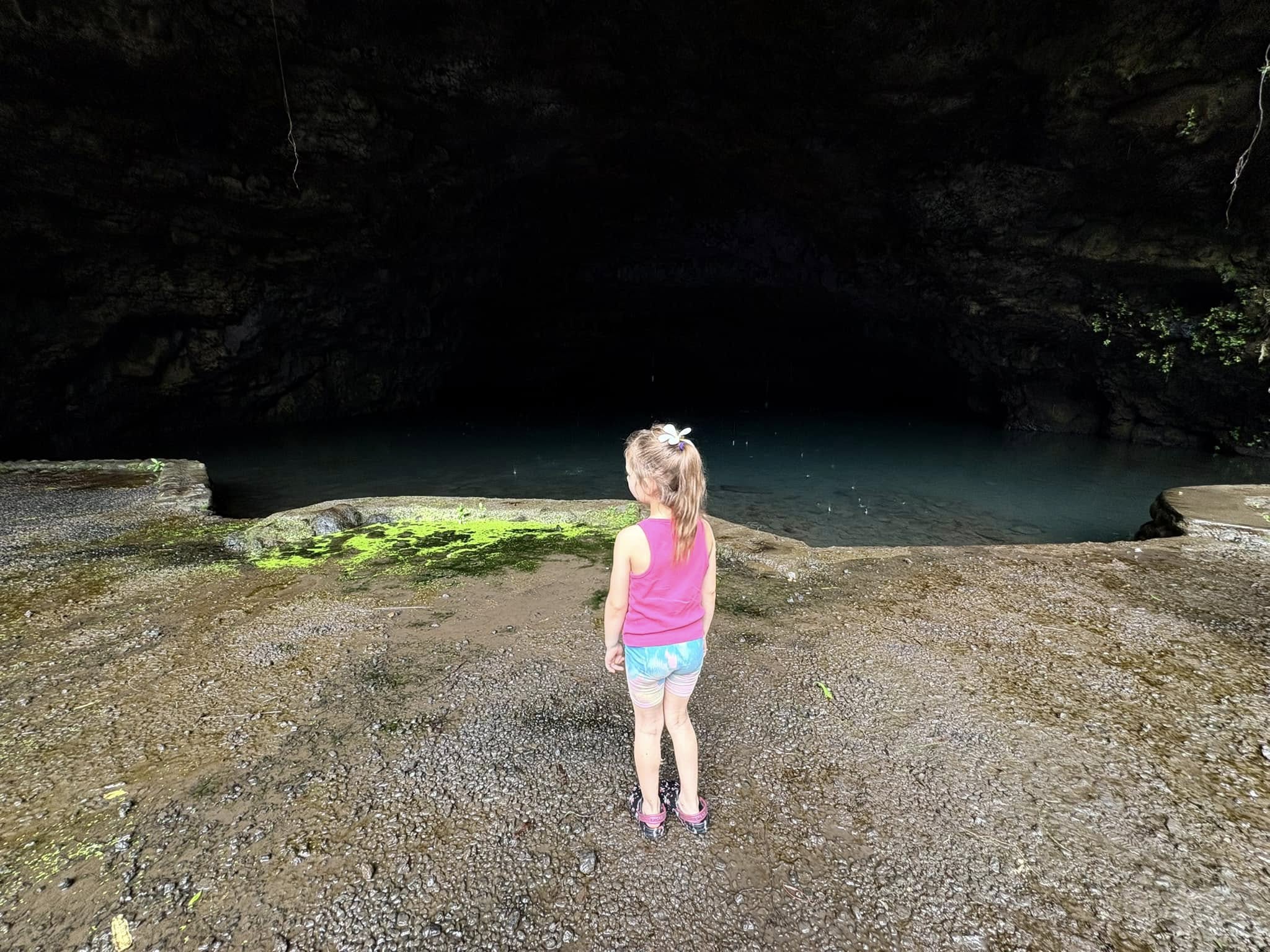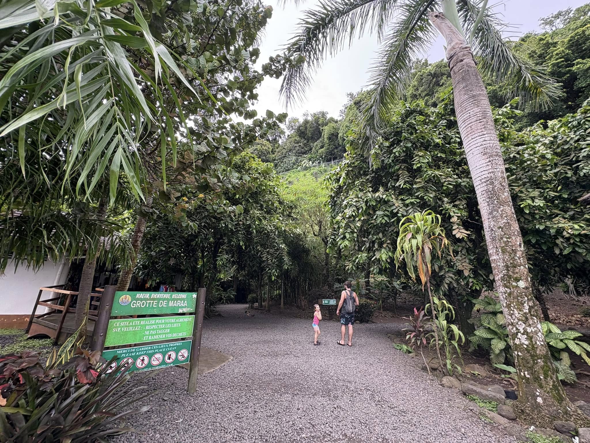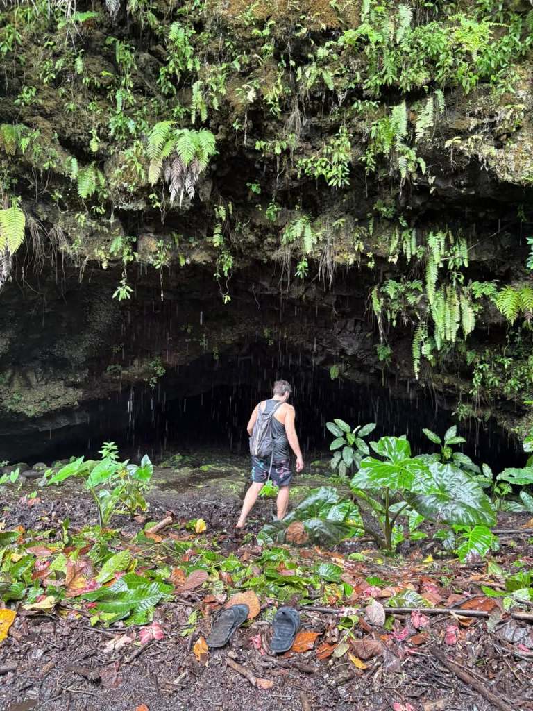 Mara’a Cave is a place of beauty, just off the coastal highway, 28km (or about a 35 minute drive) from Pape’ete. There’s a small little pull off on the right side of the highway, right beside the water. There’s no beach there, but it was our first real chance to take in the beauty of the ocean. Then, it was a hop, skip, and a jump across the road towards fern gully. Tall, majestic trees, bunches of bamboo clicking in the wind, lush jungle greens, and chickens. That’s what’s found in the lead up to the these three natural caves carved into the mountainous terrain. I was expecting it to be a bit of a hike, because you can’t really see anything from the road. But as we stepped on to the path and rounded the corner, we were surprised to find the caves were no more than a few meters away.