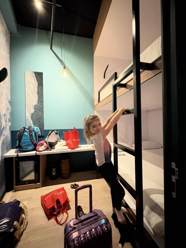 We snatched up our “boutique hotel” for $150. A simple, window-less room with a queen-sized bunk bed, mini fridge, a shelf, and shared bathrooms with the rest of the floor. It was cute though, with a large surfer wall painting, comfy beds, and customizable RBG LED strip lights around the beds that M loved to play with. There was also a rooftop bar (which, yes, was one of the main reasons I was drawn to it in the first place). Sadly, though, we missed making our way to the top due to its bar-like opening hours (4pm -1am… and kids are only allowed from 4-7pm). But no matter. We had a car and now only one full day to explore the island before heading across the water to the island of Moorea.