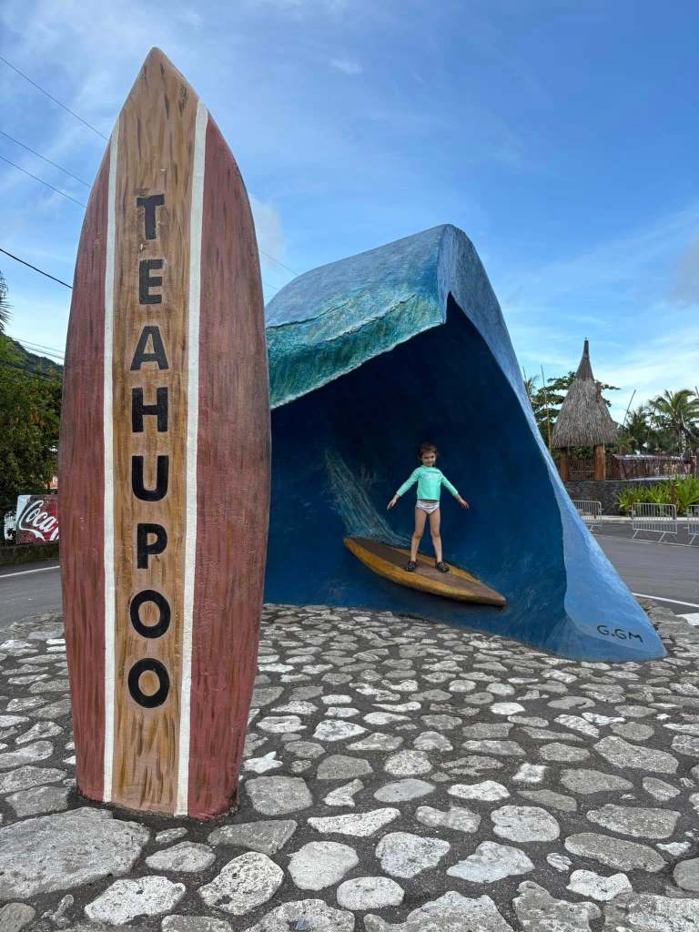 Teahupo’o is located at the very end of the road on Tahiti-iti (literally – the road just stops at a round-about and spits you back out the other way). This little surf town is located 75km, or about a 1.5 hour drive from Pape’ete. And if the name sounds familiar, that’s because it was big news last year – as the official surfing venue for the 2024 Paris summer Olympics. The waves at Teahupo’o are world renowned as some of the largest, heaviest, and most deadly in the world, not only due to their size, but the shallow coral reef positioned just below their breaking point.